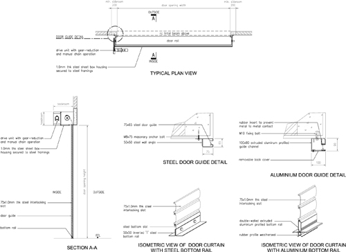 Roll-formed galvanized steel guide channel; of overall size 65mm x 75mm deep. The channels are secured to a continuous length of wall angle size 50mm x 50mm, spanning the entire height of the shutter and bolted to the walls of the door opening.